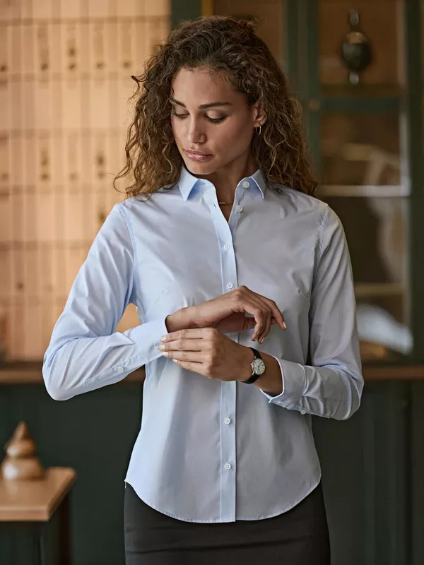 Damska koszula wysokiej jakości z dodatkiem elastanu. Koszula Tee Jays Luxury Stretch wykonana jest z połączenia bawełny i elastanu (4%), ma dopasowany fason i przyjemny i łatwy w pielęgnacji materiał. Koszula polecana dla pracowników, gdzie liczy się nienaganna prezencja i elegancki wygląd. Posiada nowoczesny, usztywniony kołnierzyk i mankiety, półokrągły spód, karczek z dwoma zaszewkami, eleganckie perłowe guziki. Na koszulach firmowych doskonale prezentuje się haft komputerowy z Twoim logo. Zobacz także podobny model dla Panów: Koszula Tee Jays 4021